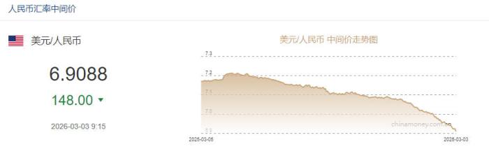 3月3日人民币对美元中间价报6.9088 上调148个基点
